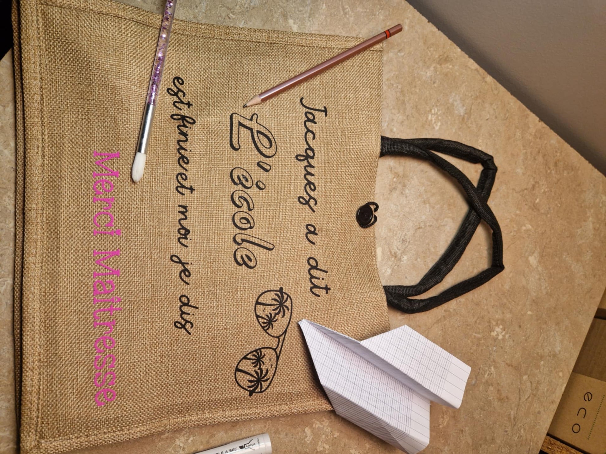 Ce sac cabas en jute naturel est parfait pour remercier une maîtresse ou un maître avec une touche d’humour. Son message original :